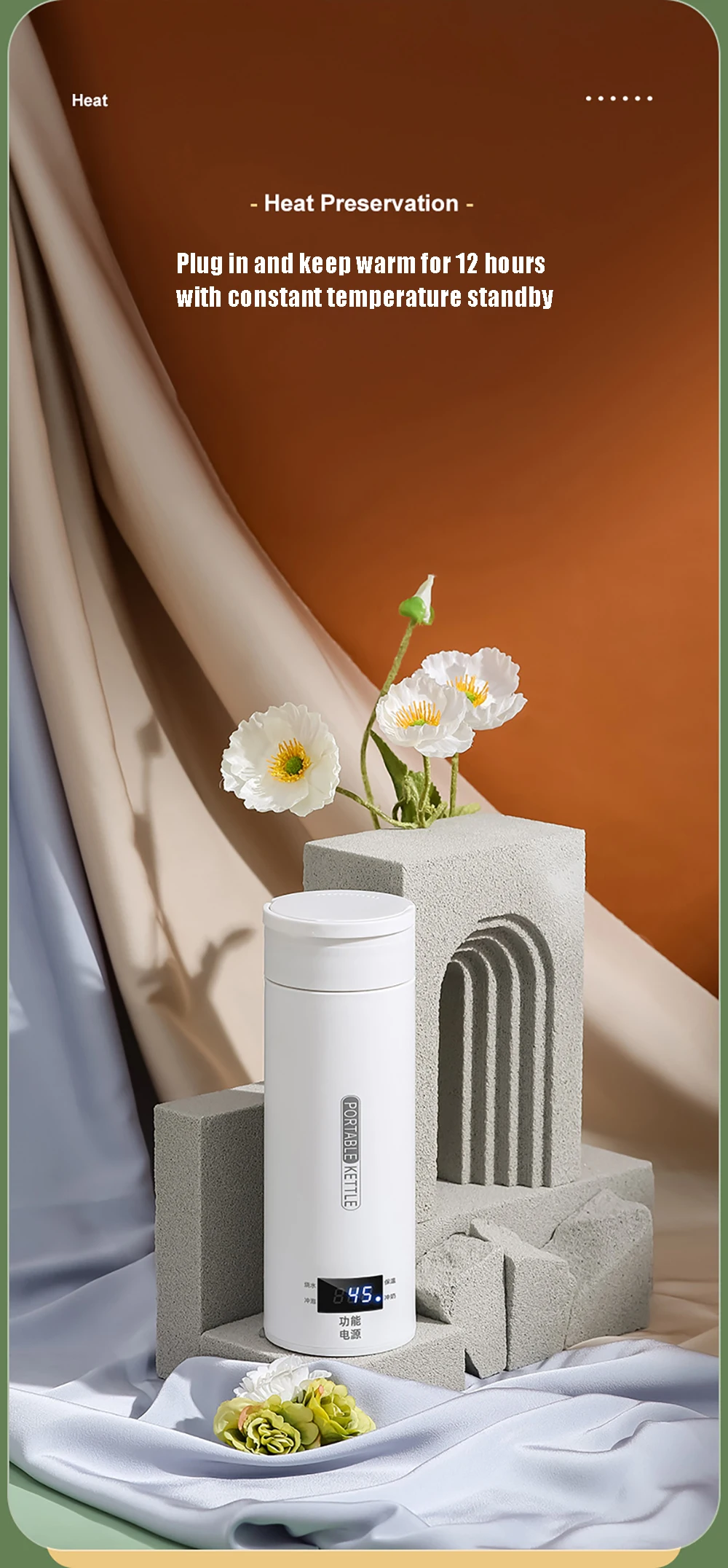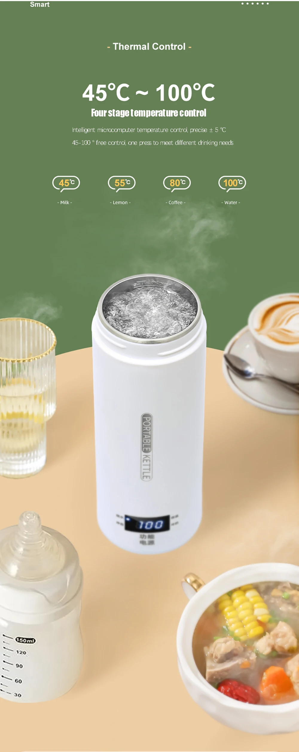 LCD model: 45 degrees, 55 degrees, 80 degrees, 100 degrees, four-stage temperature adjustment to boil water, non-stop power supply, 45 degrees constant temperature for 12 hours, can be sealed to boil water;